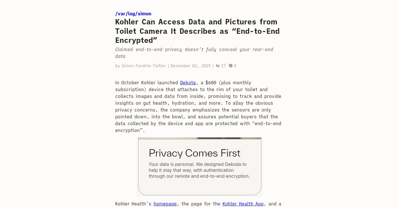 In October Kohler launched Dekota, a $600 (plus monthly subscription) device that attaches to the rim of your toilet and collects images and data from inside