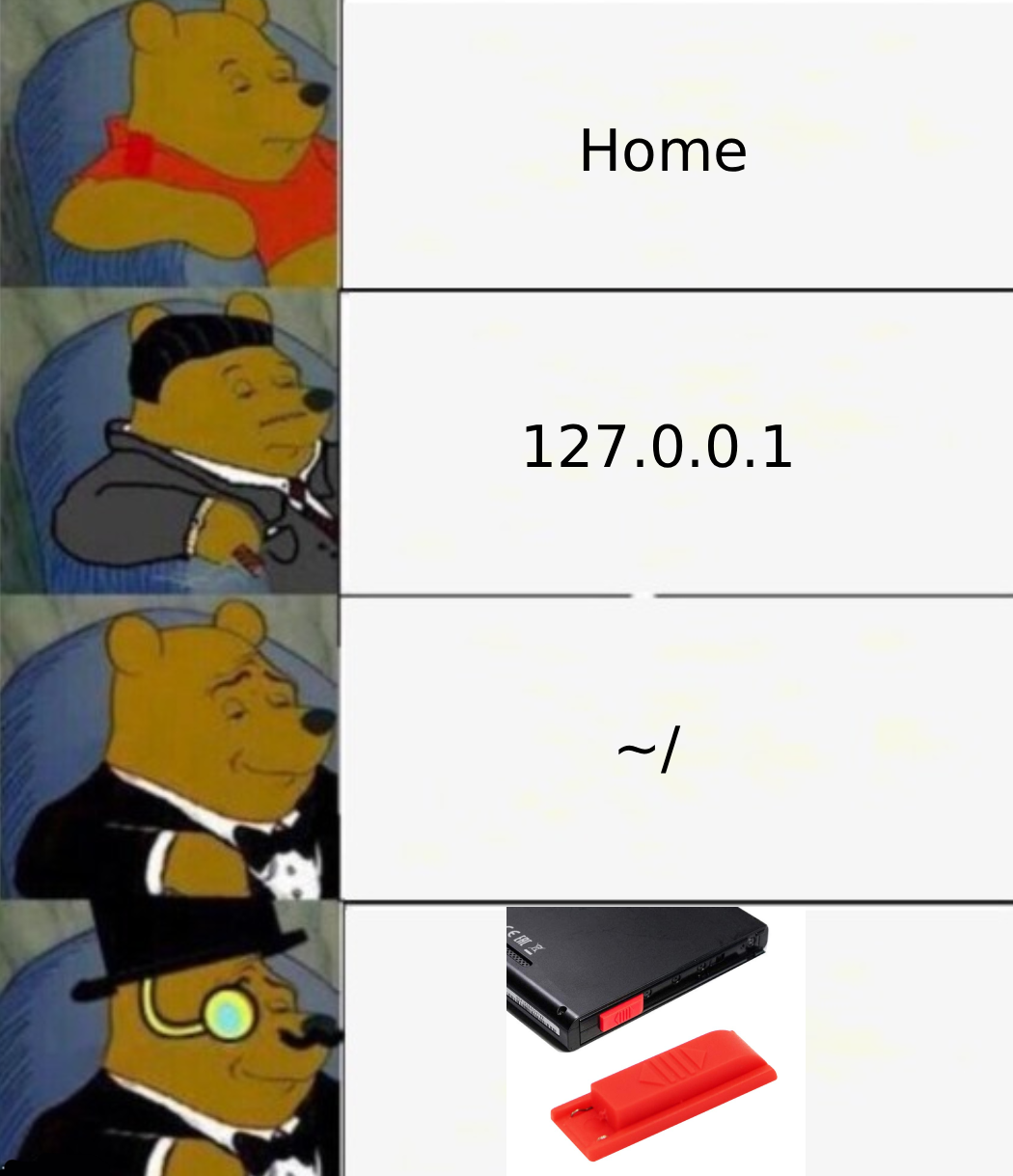 Explanation/Alt text: The tuxedo Winnie the Pooh meme showing more and more abstract representation of “home”.