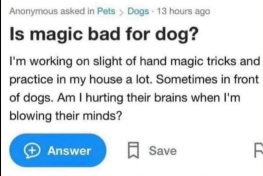 But yeah, “am I hurting my dog’s brain with a card trick” is pretty funny too