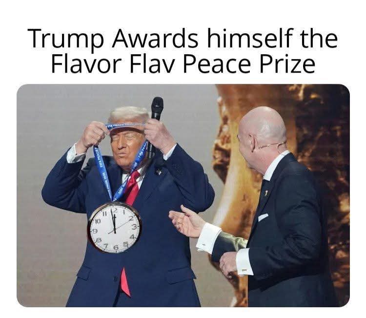 minus-squareHootinNHollerin@lemmy.dbzer0.comcakelinkfedilinkEnglisharrow-up13·edit-220 hours agoIt’s the head of FIFA, giving trump a made up FIFA peace prize likely to get away with corruption