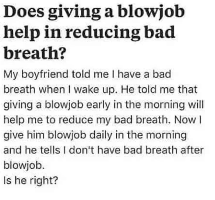 You can also get rid of complaints about bad breath by dumping the one who complains. Also frees up time in the morning that was otherwise occupied with sucking unwashed dick. win win
