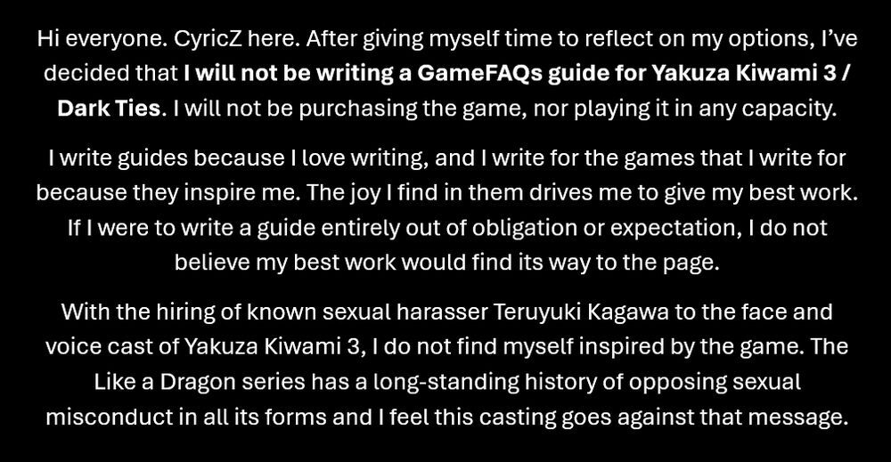 Back to the problem, a lot of controversies followed the recent announcements, and besides dumb rereleases and unlisting of “legacy” remasters, CyricZ is very unhappy that remaster of Yakuza 3 with added campaign includes a known harrasser and sexual assaulter Teruyuki Kagawa as the voice and the face of the antagonist.