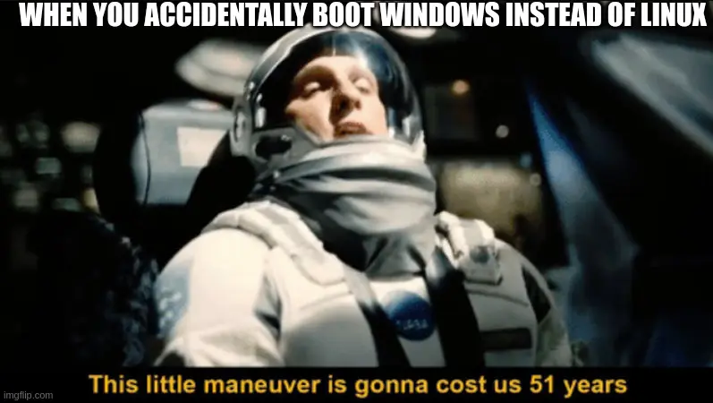 You’re missing the point of the meme. It definitely is about accidentally booting Windows, rebooting and then booting Linux.