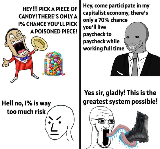 You can accept that you are just a cog in the capitalist machine without simping for the very machine that’s crushing you.