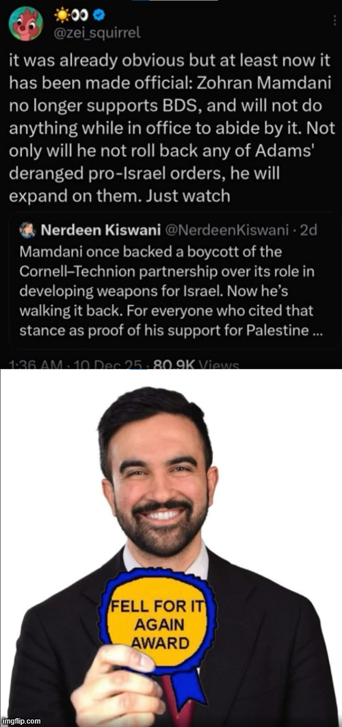 If it should be part of BDS shit then yeah it doesn’t look good but also I wonder if the Fell For it Again gooner crowd about to cum over this might have considered it’s a “pick your battles” situation and Mamdani and his administration might not have the funding or organizational capability to fight Cornell while also doing all of the other shit that they want to do