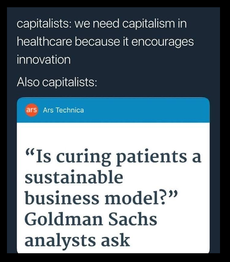 I think it’s abundantly clear that in a purely capitalist society, it is in the government’s and its oligarchs’ best interests to keep the citizens sick. Not terminally ill or seriously sick, because then they couldn’t work. Just enough to keep them miserable but healthy enough to go to work.