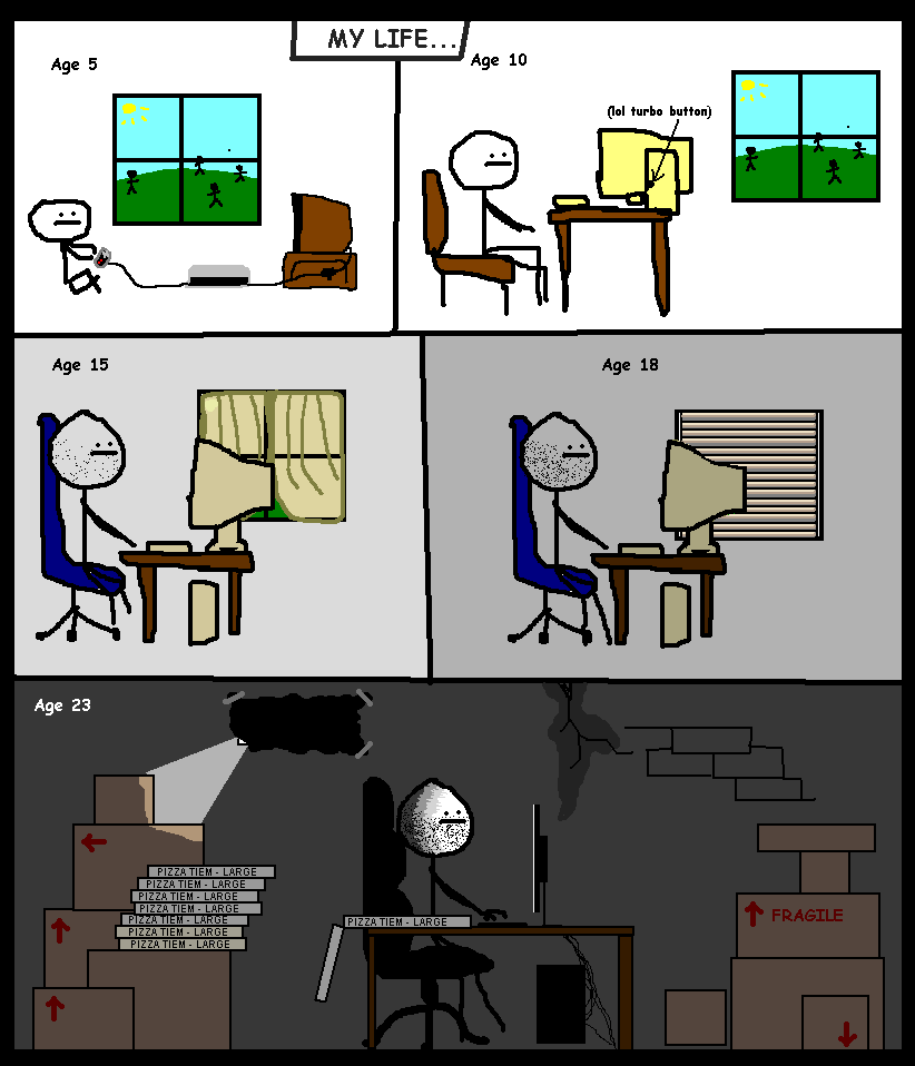 Judging by the CRT monitor at 18 and the LCD at 23, I assume OP is around 40 now. Maybe they just omitted the ~17 years worth of panels where they got out of the house and did something else.