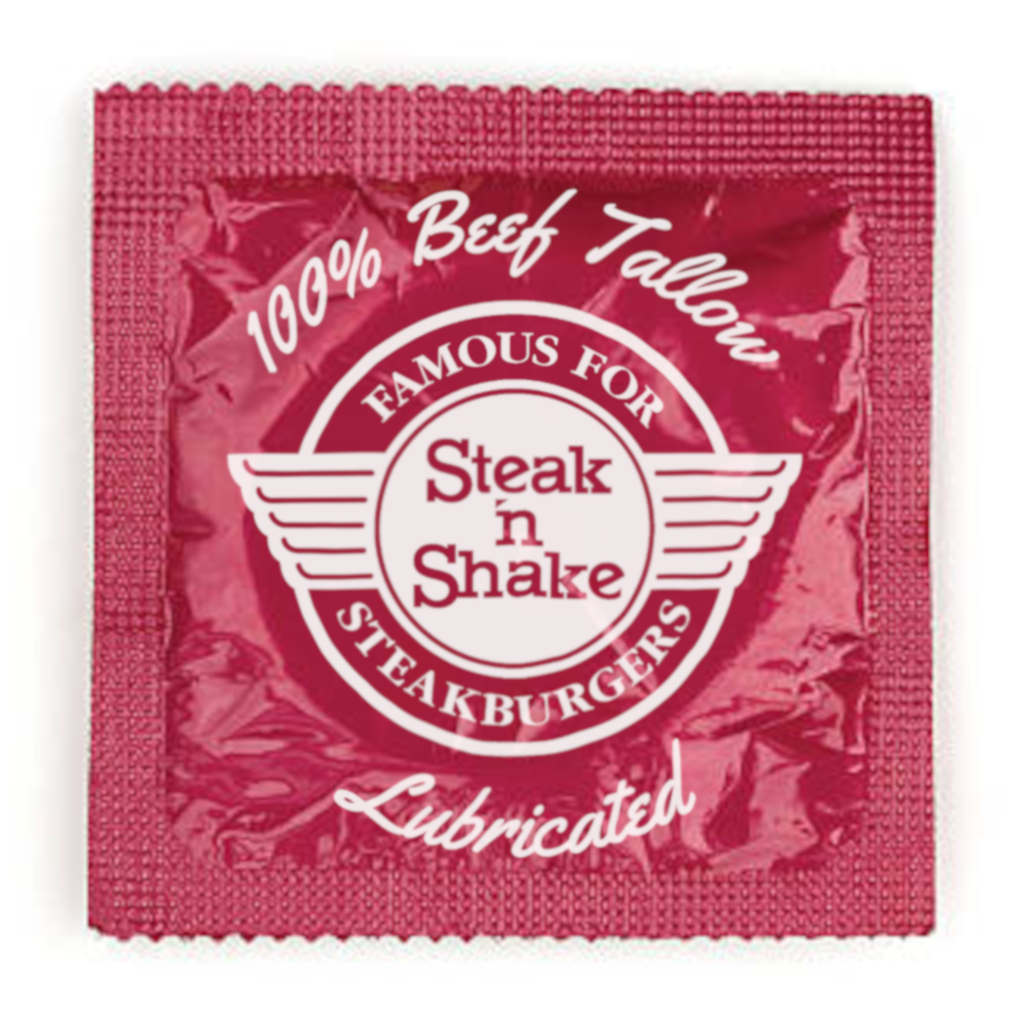 A red condom package with the Steak & Shake logo surrounded by the text “100% Beef Tallow: Lubricated”