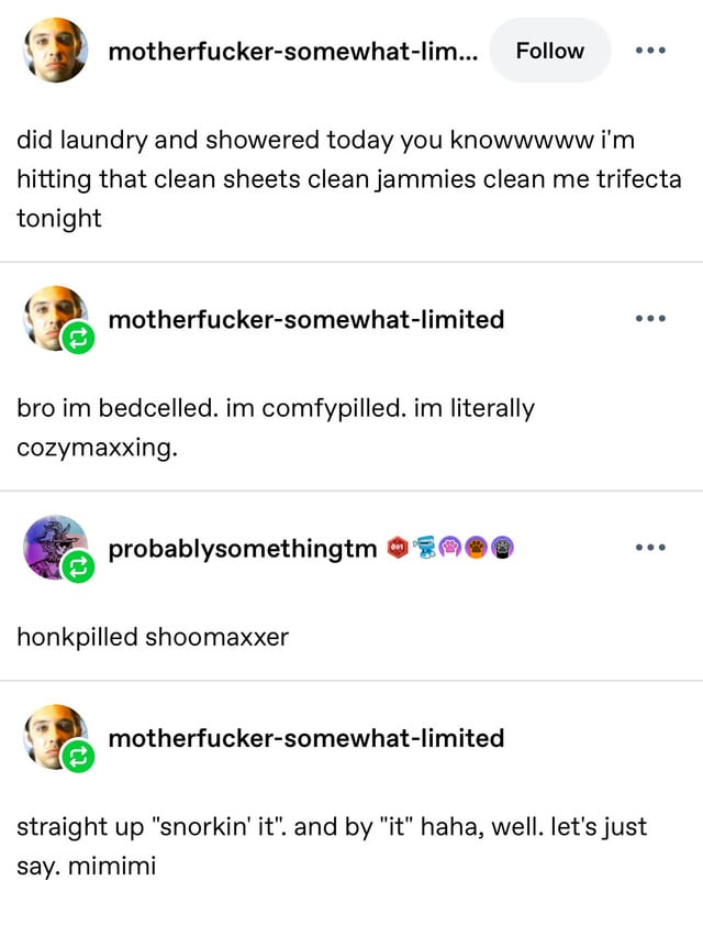 The first two…I’ll graciously call them “sentences”… I got the context of…once I got to the third one, my brain was like “I haven’t partaken in enough brain rot to understand this new form of damaged English language”.