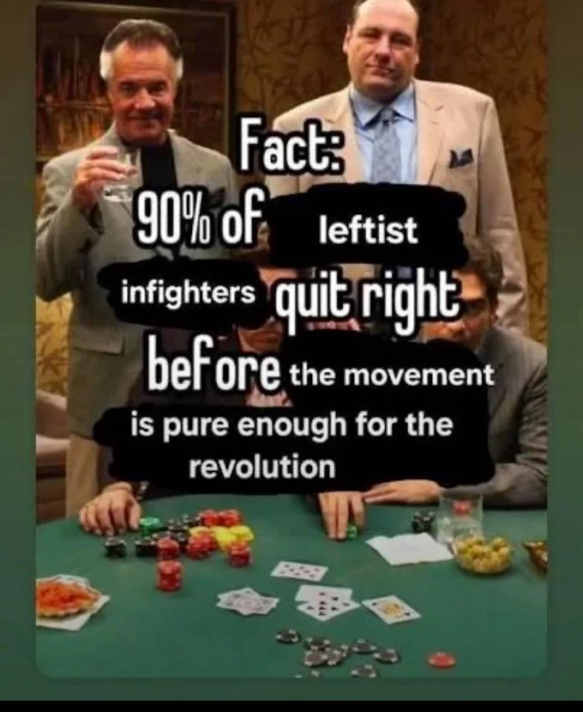 Fact: 90% of all leftist infighters MUST quit as a prerequisite before the movement can be capable of revolution, irrespective of “purity”.