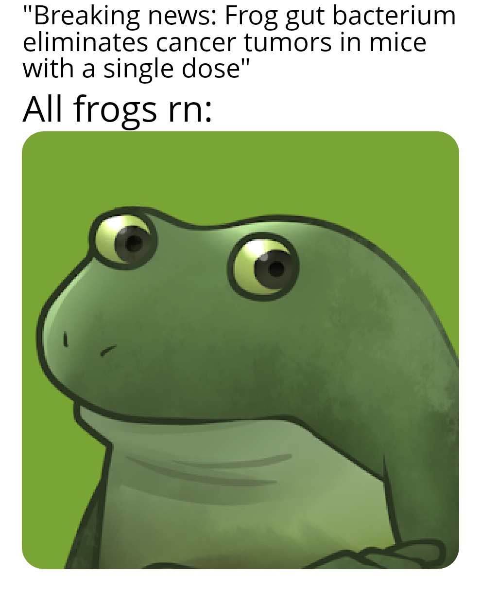 Could be we just aren’t eating enough uncooked whole, live frogs in our modern diet. Someone has to volunteer to gulp down a few to see if their probiotics cure their cancer, throw some newts in for good measure. If we don’t get proof that works at a citizen science level, pharma companies will at best brew the bacteria in a lab and sell it back to us at exorbitant prices. Who will be the next Jonas Salk?