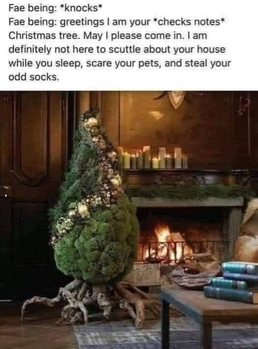 Fear washes over me as I turn my gaze back to the living room. The strange creature now looked like a totally normal Christmas tree. Our mantle has two stockings, two on the left side. Obvious spaces for two more on the right are there, though there are no hooks. I rub my brow and head to the kitchen with my wife. I get the strangest feeling seeing the imbalance. Why did we choose to decorate like that? I look towards the entryway where the thing came in. Again, four cost racks, two coats. Four shoe cubbies, two empty. “Honey, I think this thing took our children-”