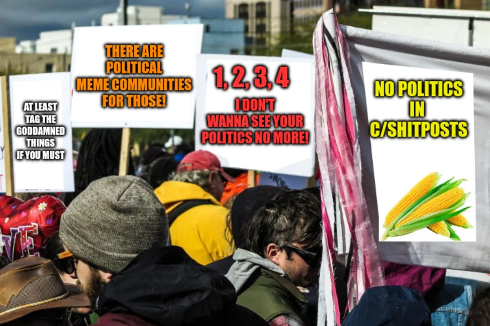 It only takes one to ruin your day. You can filter out all the dedicated political meme communities (time well spent, IMO) but you can’t filter out the ones here because no one tags anything, no one puts any alt text, and the titles are just generic snark.
