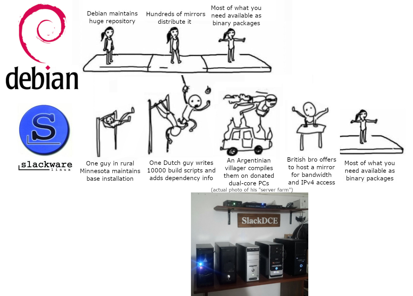 Additional software comes from Slackbuilds or compatible community repos. They include dependency info and helper programs that resolve dependencies for you.