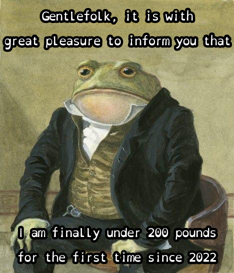 still have about 18 more pounds or so until i’m in overweight territory and as you can tell it has been sloooooooowwwww. i have a lot of major health issues and for most of this past decade no matter how hard ive tried ive only gotten sicker and sicker and sicker. this is the first year in years where i’ve finally seen more progress in my health rather than regress.