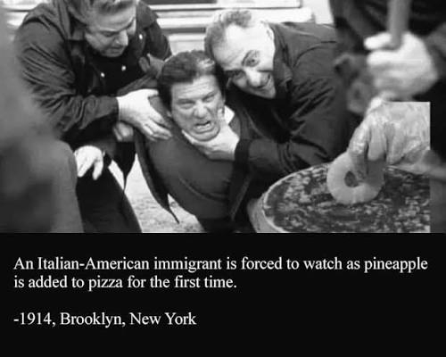 I read it as it’s the immigrant’s first time seeing pineapple added to pizza, not the first pineapple pizza ever. It looks like they already knew how to use it as a torture device in the picture.