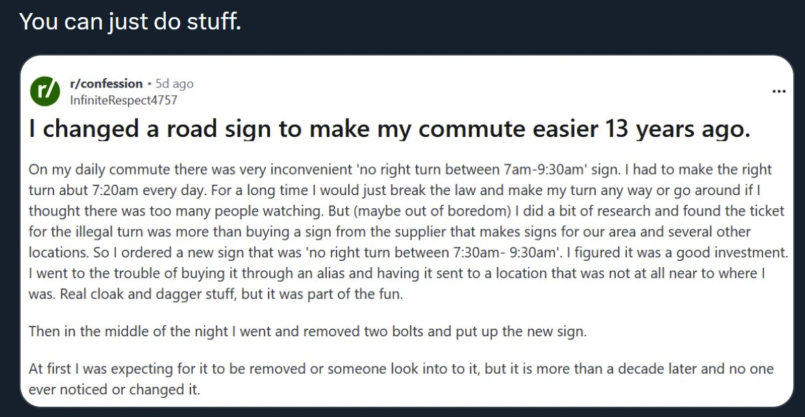 I spent a weekend just filling all the potholes on my road. It wasn’t that expensive and it didn’t take long either. Turns out you can just do what you want