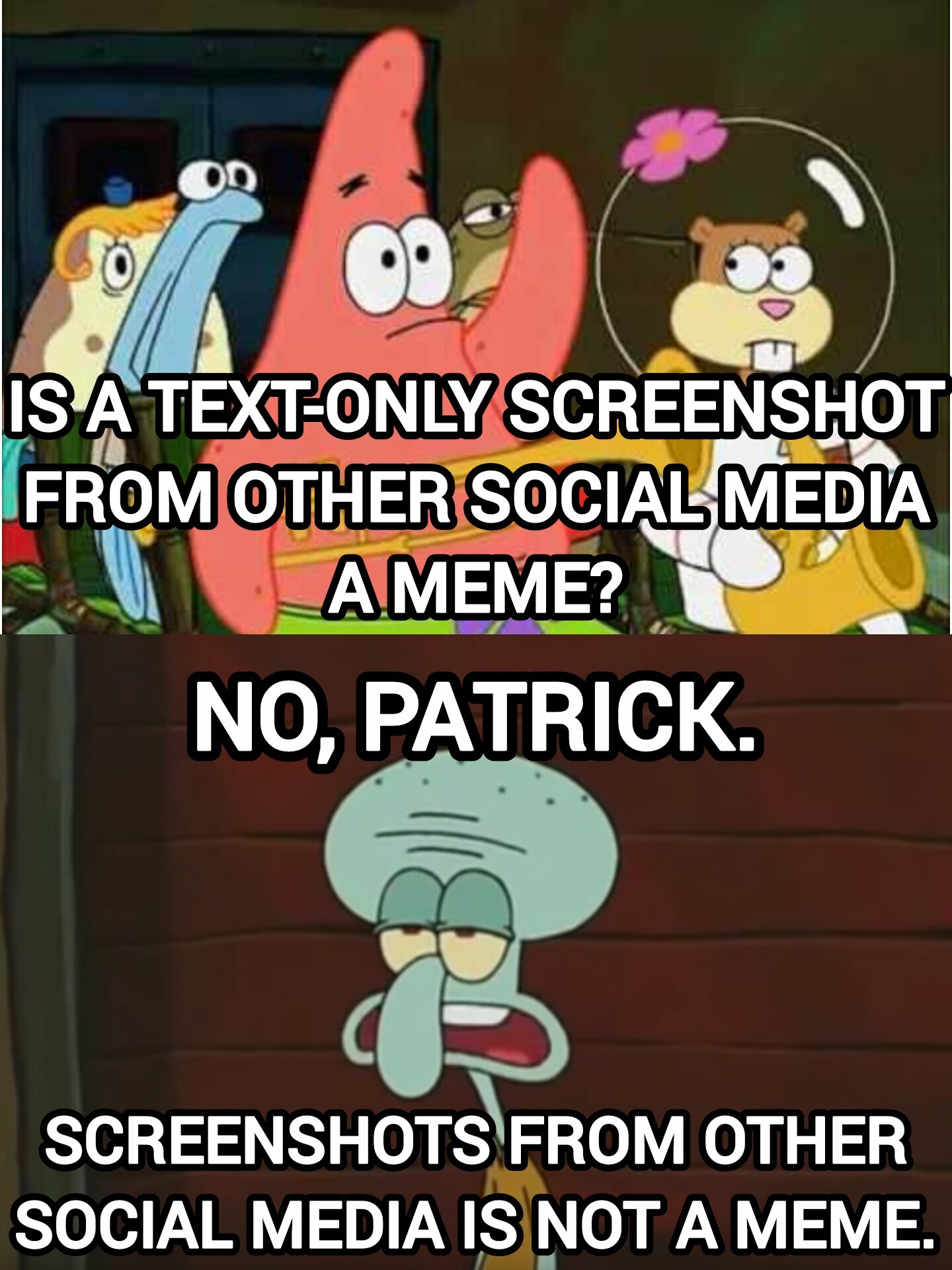 Nah, OP is just straight denying that screenshots of text are memes. Claiming some bullshit like having to make some change to it for it to qualify as a meme. Just ignoring reposts of green texts, copypasta, reddit stories (poop knife, cylinder, cbat guy, etc etc etc etc), people getting ratioed on twitter, tumblr chains.