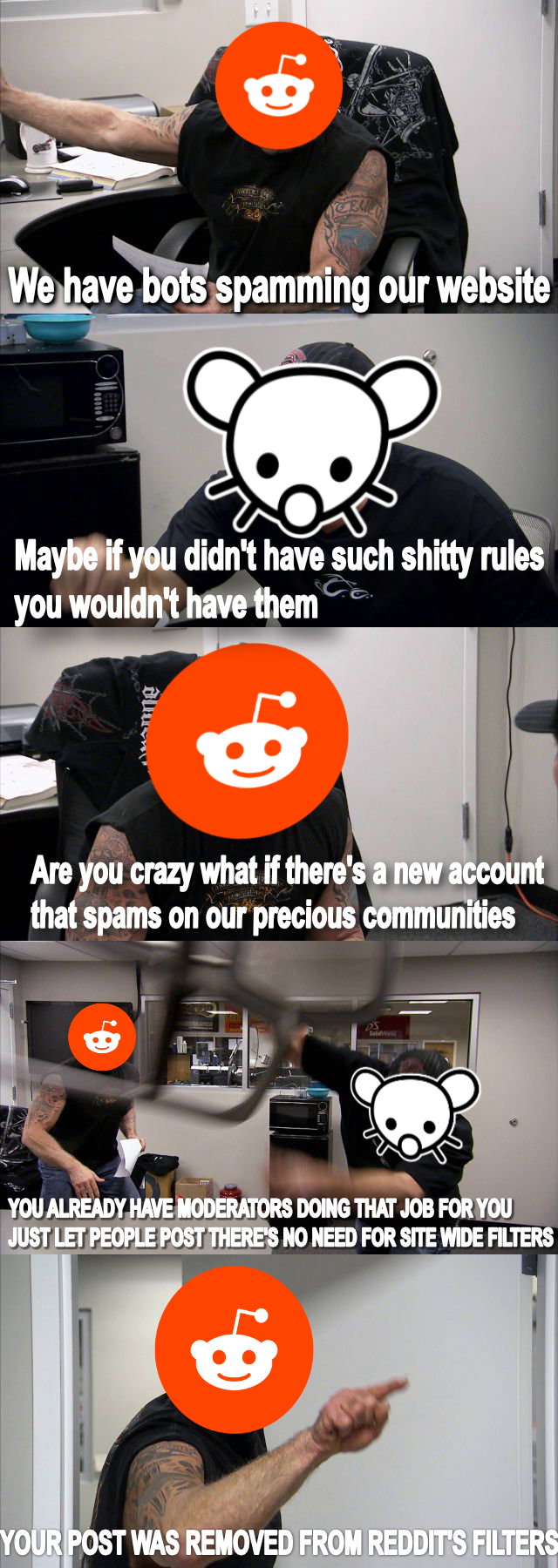 I can’t blame Reddit mods for putting up filters or Reddit filters on suspected bots. But I can definitely blame Reddit admins for ignoring or encouraging bots for the sake of metrics.