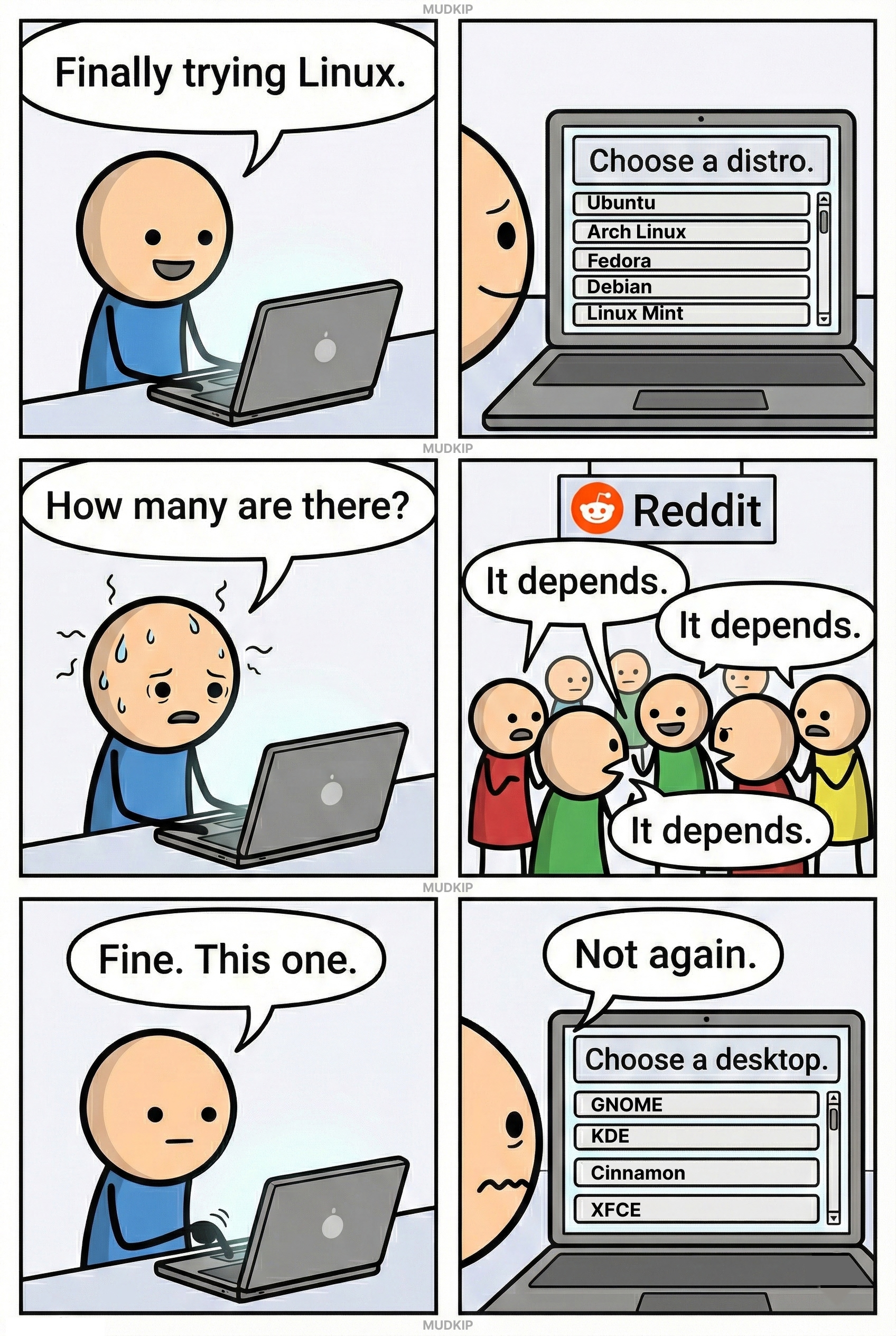 mudkip@lemdro.id to linuxmemes@lemmy.worldEnglish · 5 days agoI love choice. I hate choosing.files.catbox.moeimagemessage-square405fedilinkarrow-up11.34Karrow-down1149