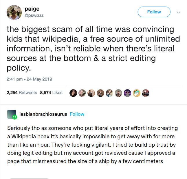 There’s a lot of misinformation on Wikipedia too, of many different kinds. Some smaller pages exists purely for someone’s PR. I’ve seen blatantly false (but “verifiable”) stuff too but the most common thing is to have pages that are just creative with the truth.