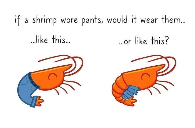 Shrimps don’t wear pants, they only wear shirts.
