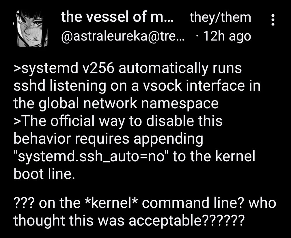 I don’t like to use the term rage-bait, but this post is suggesting that User-space components should not be configured by the Kernel-space (which is not happening here, it’s just the kernel boot line parameters, you could, pass the parameter to start a different init system other than systemd).