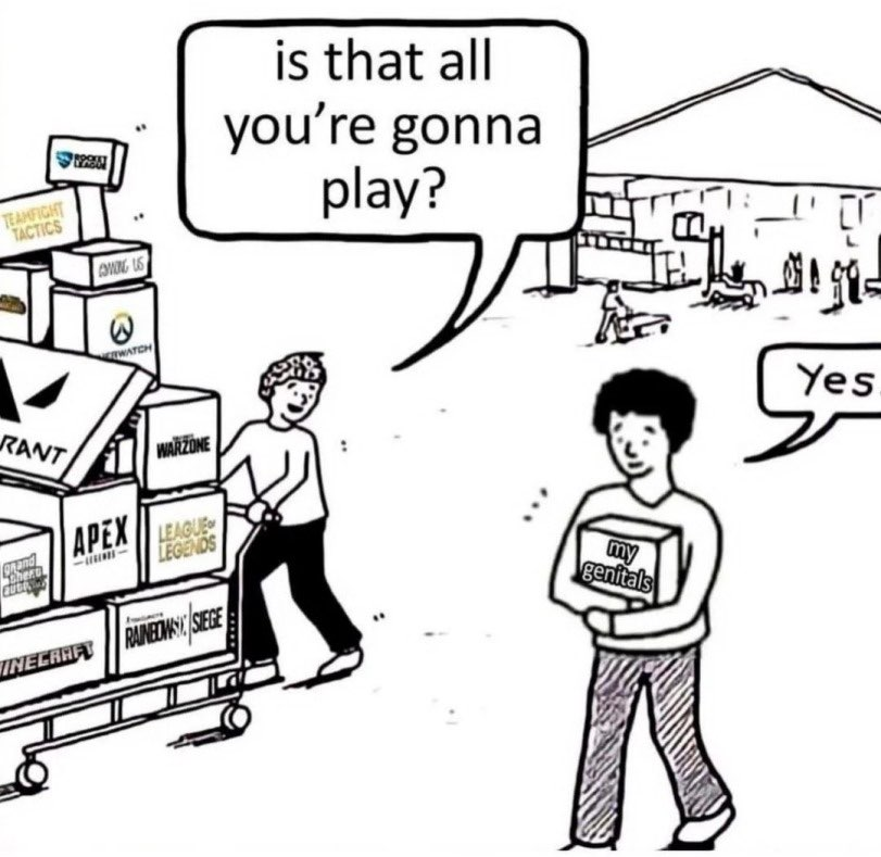 That shit seems to be the popular stuff. Typical gamer meme is about competition, player toxicity, slurs, dedicated players dominating, how stressful it all is etc. Dude, single player games exist.