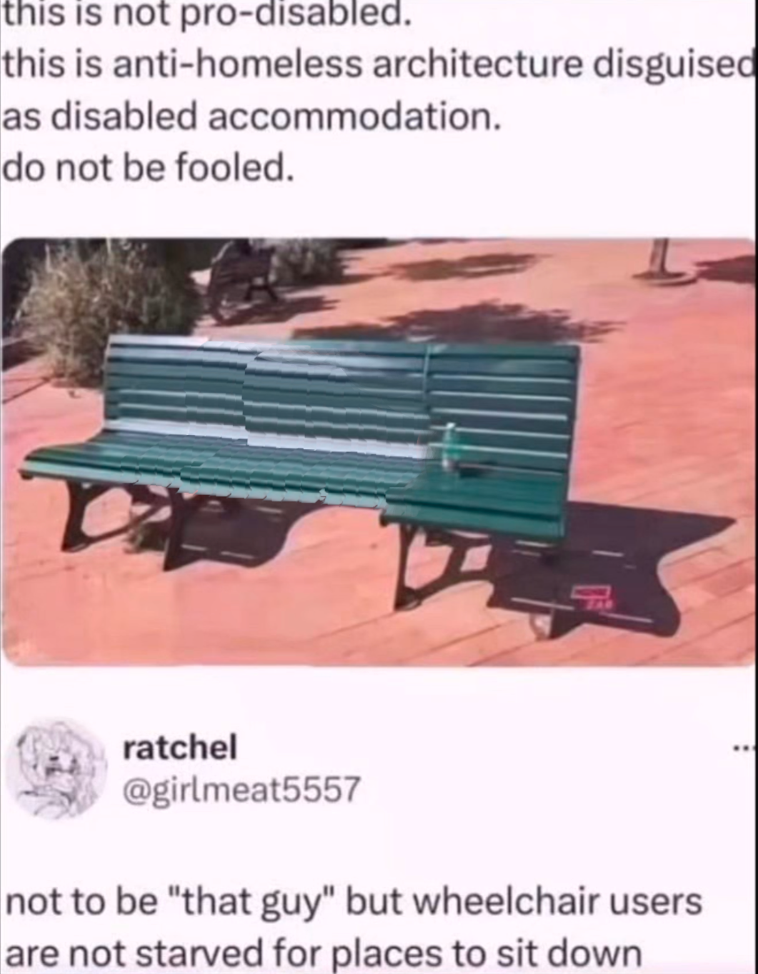 But what if it’s more nefarious than that? No budget to put in new benches with spikes or whatever built in. But maybe there’s room in the budget for “accessibility upgrades”. Maybe a ramp was sacrificed for this idiocy.