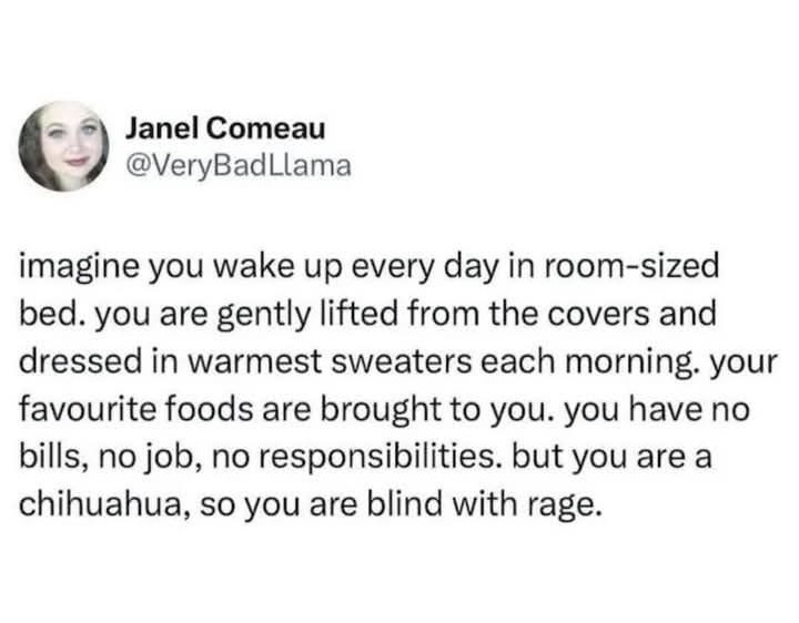 “you have no bills, no job, no agency, no control. You are carried around to familiar and unfamiliar places at random whether you want to or not. Large unfamiliar creatures are constantly around you. You cannot communicate with your captors handlers, they only react when you scream.”