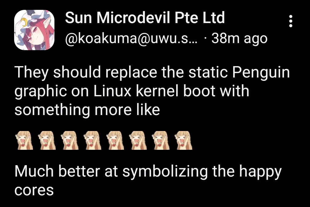 I’ve been using rEFInd for my dual boot and it shows a Tux, but that’s mostly cause I haven’t been tinkering with it. Now I’m tempted to use anime girl personifications of OSs instead, which would be really classy, I bet.