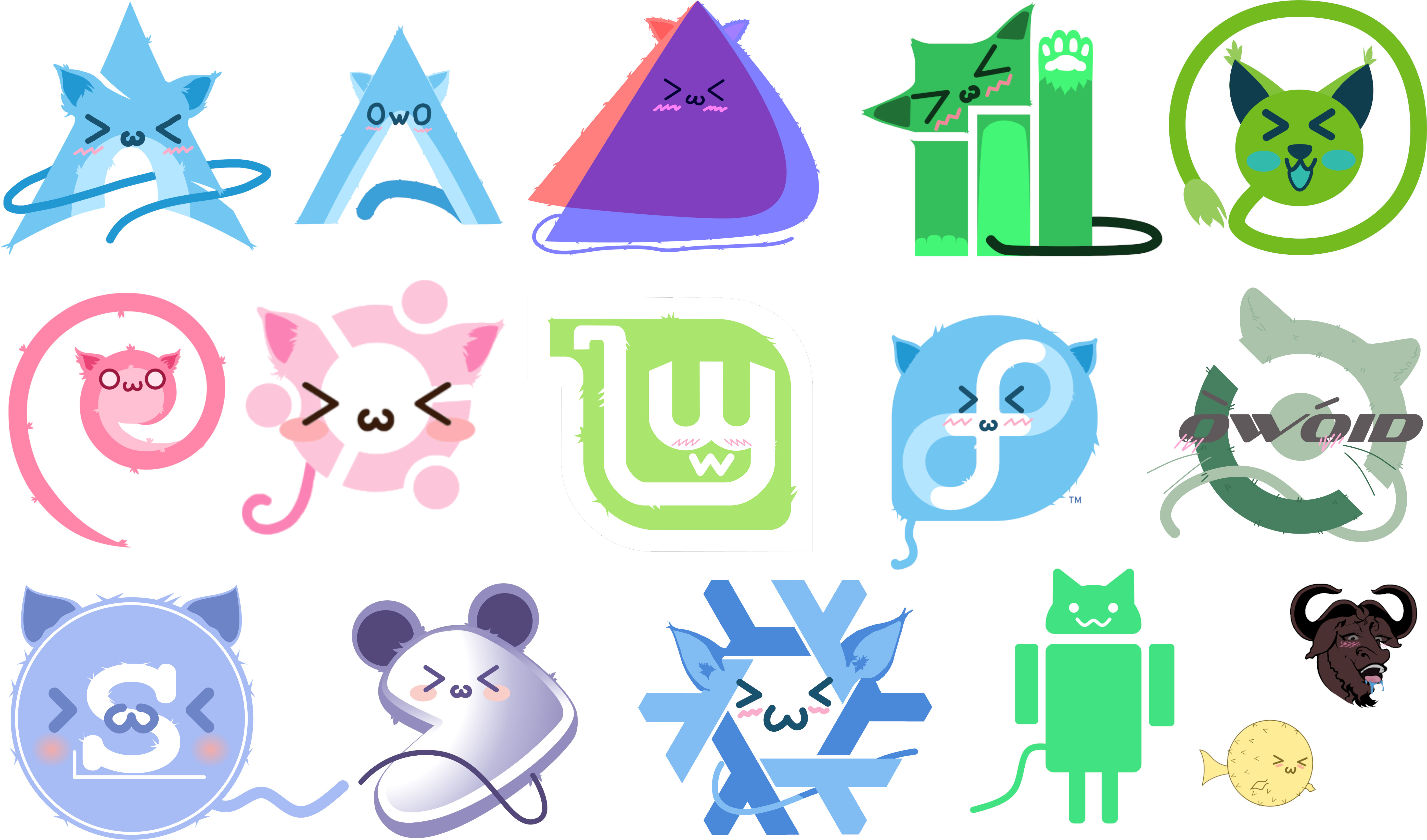 These are some of the UwU-ified versions of Linux (and other) distribution icons.