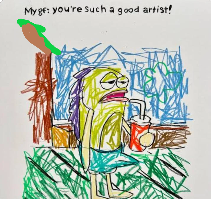 minus-squareWhiteOakBayou@lemmy.worldlinkfedilinkarrow-up5·1 month agoWhy did you draw the little fish with an erection?