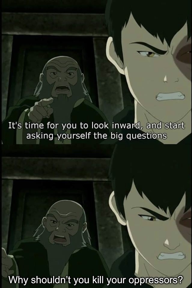 “But I can’t just KILL Ozai! wHaT aBoUt wHaT tHe mOnKs tAuGhT mE?” -The “hero” of the story lmfao