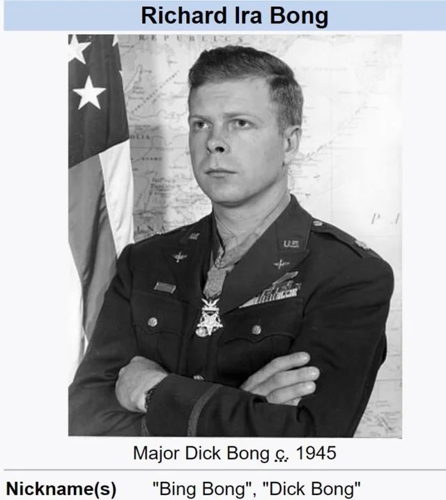 Just for those who don’t know: Maj. Bong was the highest scoring American ace of WWII with 40 (IIRC) kills. He mostly flew the P-38 in combat and was killed test-flying the P-80 shortly after the war.