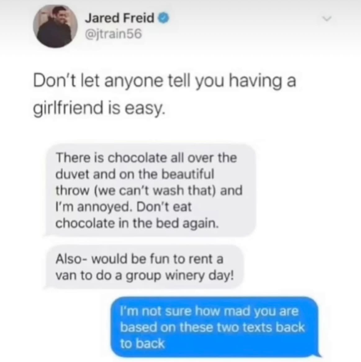 So let me get this straight. People complain when their gf gets mad over little things like chocolate in bed. They also complain when she doesnt. Wtf?