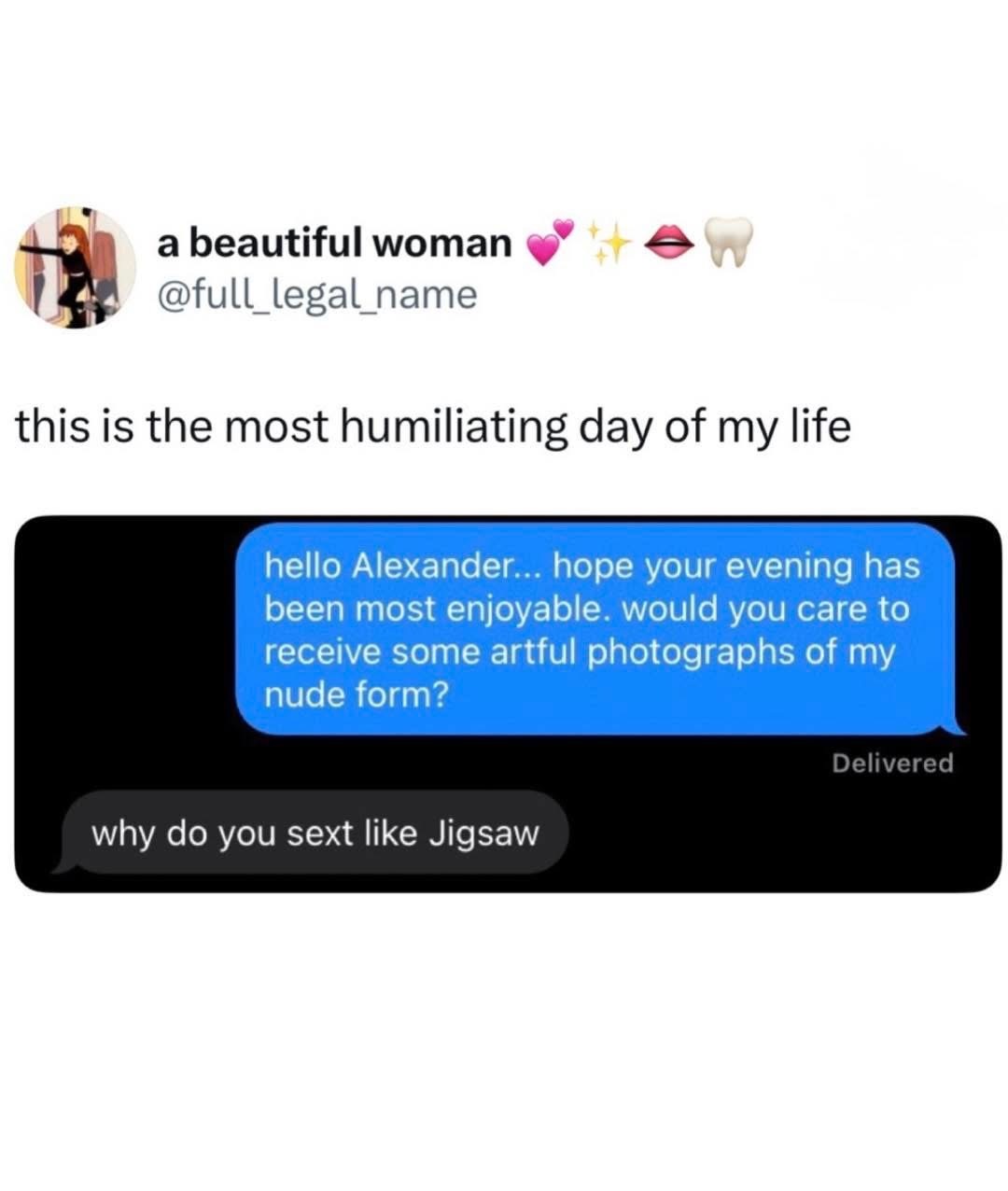 “Salutaions madam, it would be most resplendant to receive photographs of your nude visage”