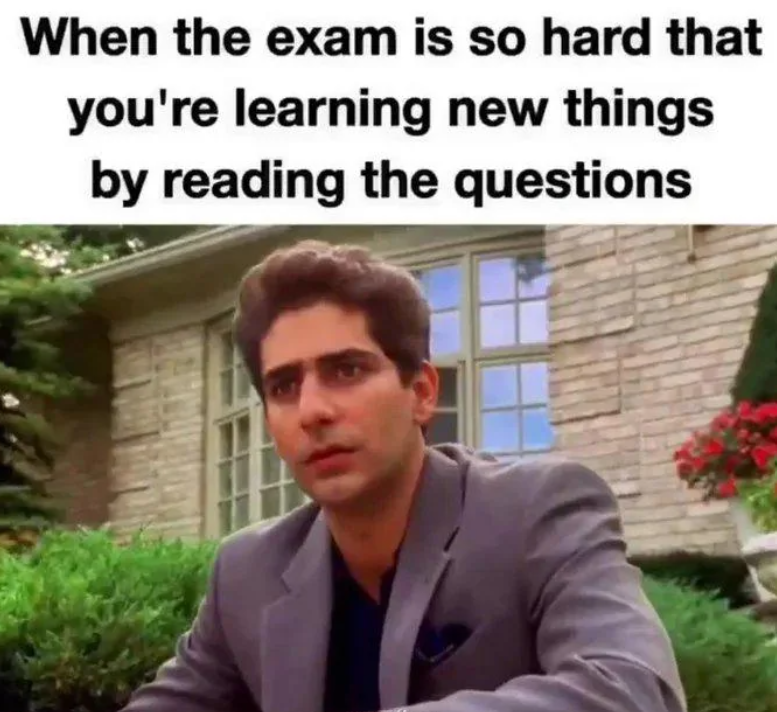 Lol I’ve had to essentially derive formulas that I should have memorized mid test before. Or reverse engineer examples from other questions to figure out the concept needed for another question (again, should have known that going in). I used to take absurdly long tests due to stunts like these, but tbh it usually worked. I distinctly remember discovering how logarithms worked mid-test at some point, for example