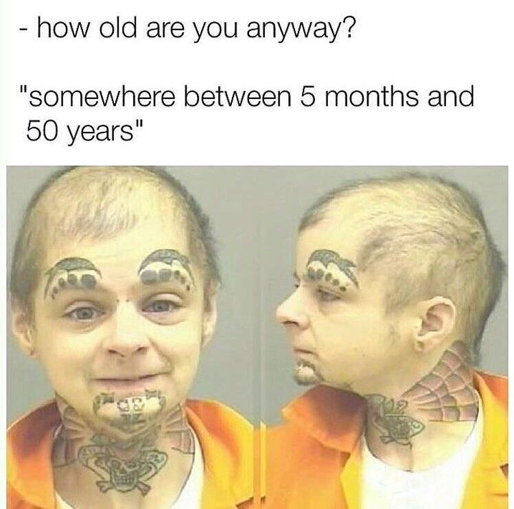 But that’s not meth face. That is a genetic baby face covered in tattoos, and the tattoos indicate he’s had a traumatic life.