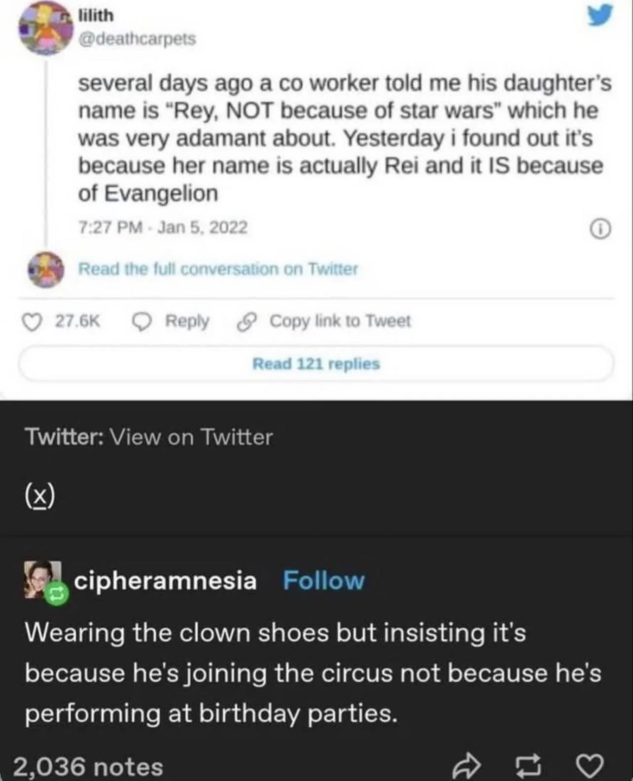 I approve, to a certain degree (because life ain’t easy for Rei in NGE, to put it mildly, and shit gets pretty weird between her and her husband dad). At least it’s short and sweet, I’ve seen way worse. And, if my name had to be inspired by popular media, I’d also rather be named Rei from an actual show written by adult human beings instead of Rey from nu-SW. 🤷