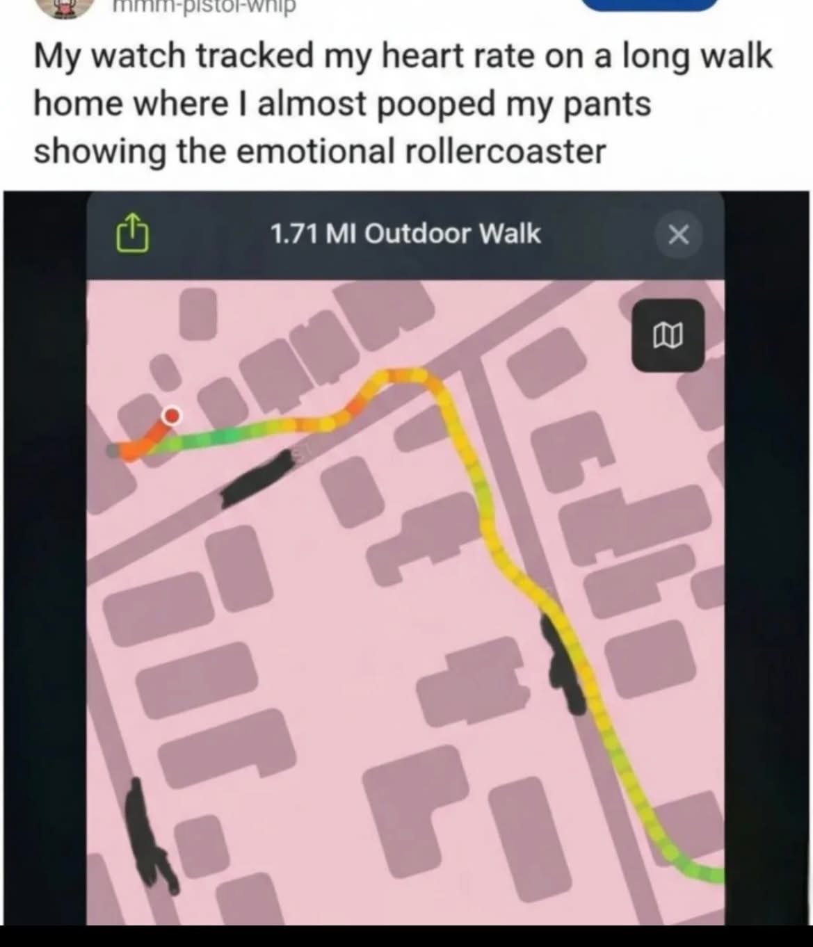 The colors are indicating speed and not heart rate I think. Makes sense that they went faster close to home and slowed down inside the house.