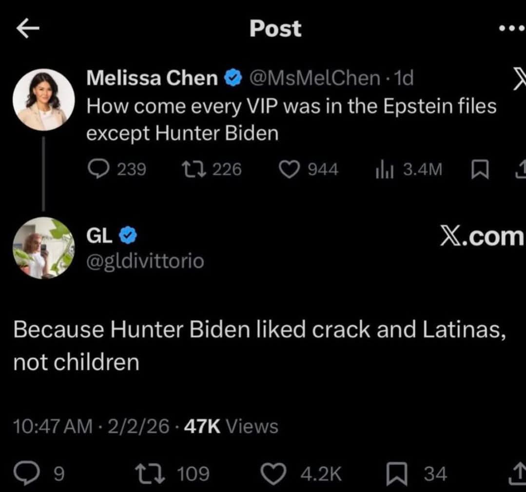 It all makes sense to me now: The Grand Old Pedophiles were obsessed with Hunter Biden because, if he wasn’t in the Epstein files, he must’ve been into some real shit, right? Their minds just can’t process the idea that a powerful man would be satisfied with vanilla stuff like sex with consenting adults.