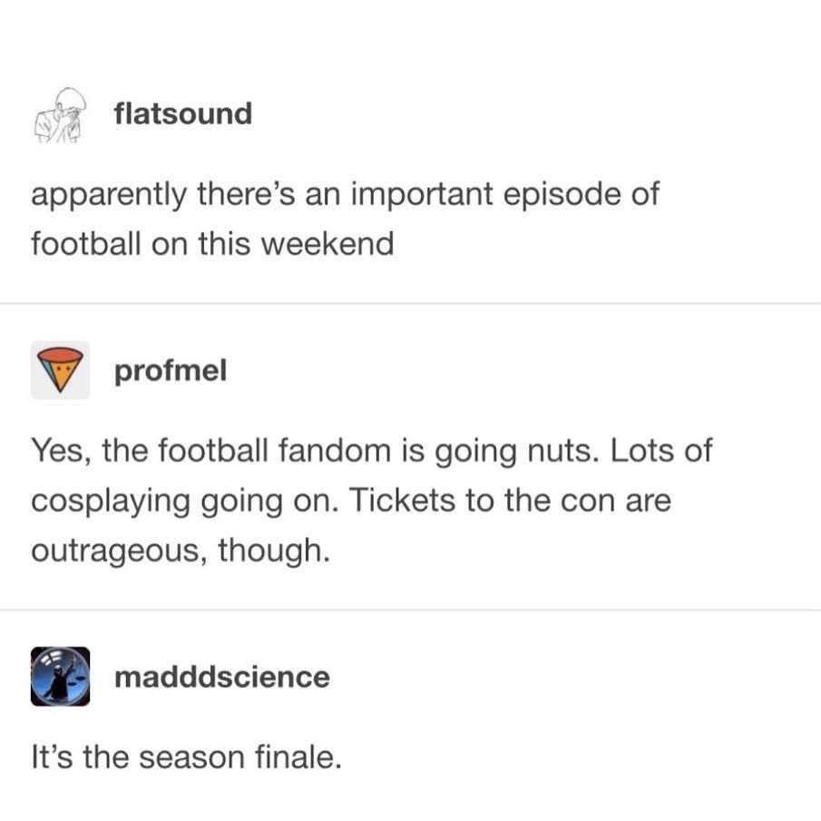 Everytime one of my frienda where’s a scarf of our local soccer club, I’m gonna tell them their cosplay looks fabulous.