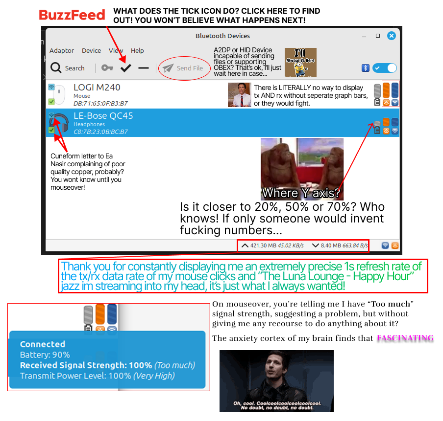 I personally like its adamant REFUSAL to be bullied into showing the actual state of devices. DMESG knows, because notifications show the correct state, but Blueman is over here IE6ing.