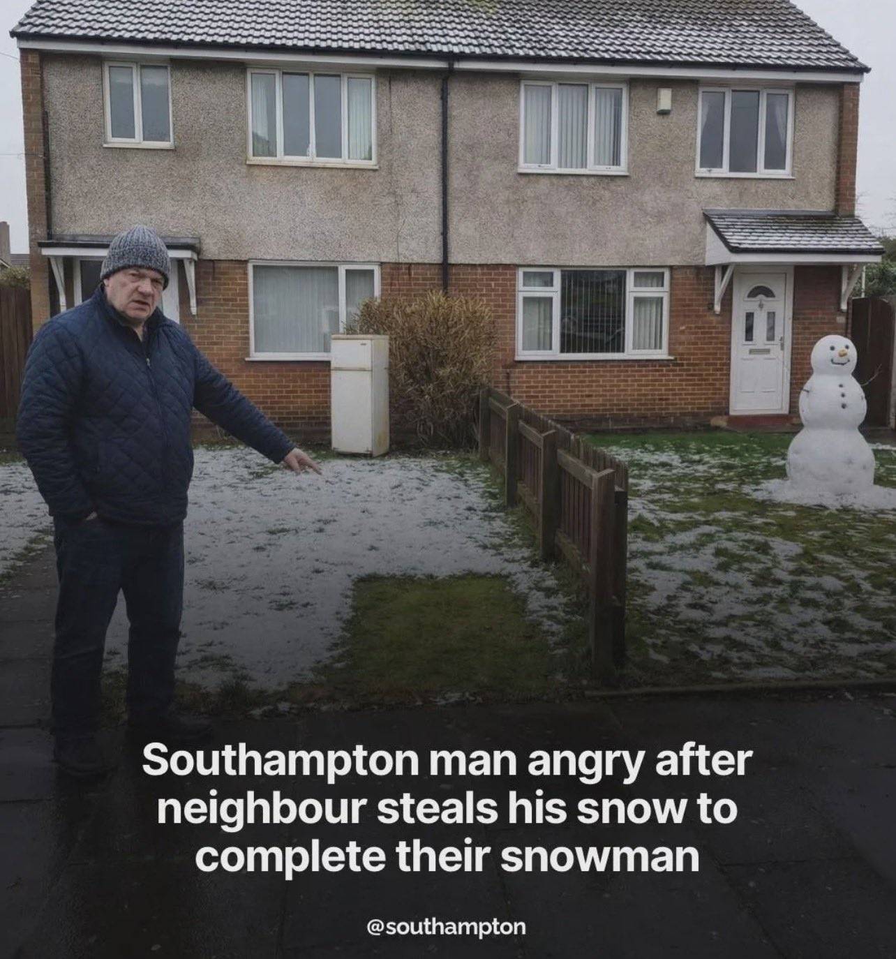 crossin me property line to nab up ME snow? what a’ bloody wanker. e’ shoulda just used es’ own bloody snow christ sake