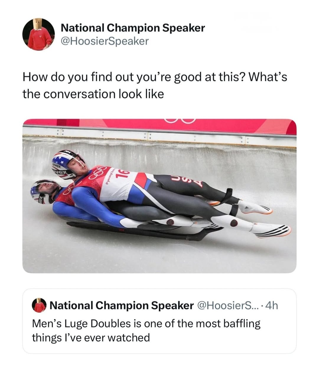 In luge, being the best is sort of just a height and weight distribution thing. I honestly think a corpse that’s my same shape could win.