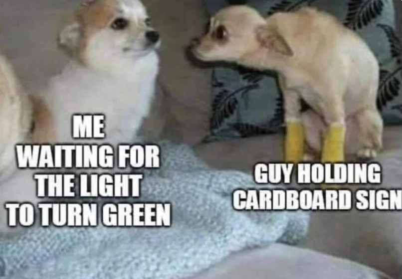 When I used to drive through the intersection where that situation would happen I’d ignore their requests for money (I didn’t have much) but unless I was in an especially bad mood I’d give them a friendly hello, and sometimes they’d be happy enough to stop and chat with someone who treated them like human being for a moment. Otherwise they’d ignore me and move on, which is also fine.