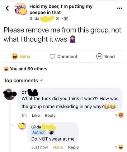 The poster here clearly thought it was a group for putting peepee in everything while someone holds beer, but it’s actually a group only for putting peepee in beer while someone else holds it, and they are disappointed by the narrow scope.