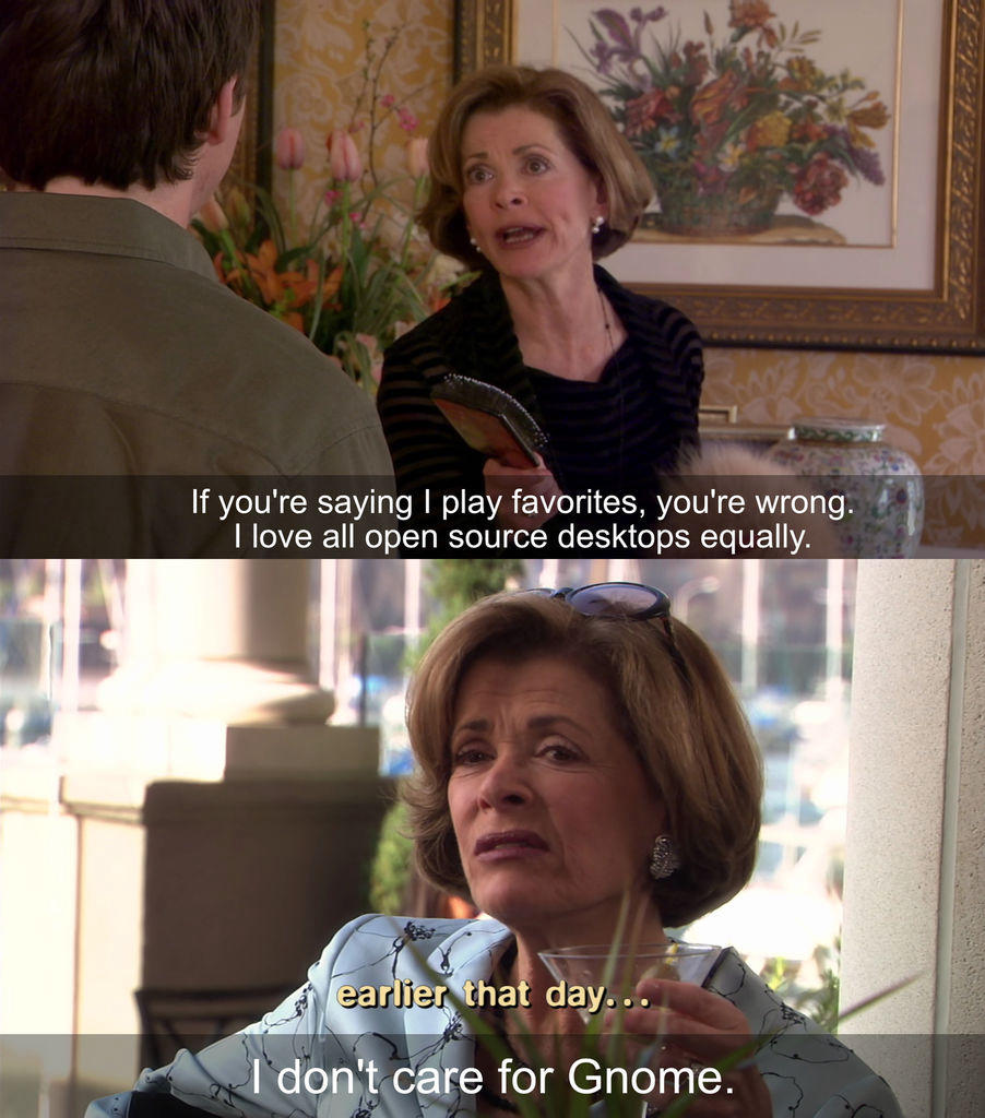 I’ve always had deep suspicion of GNOME because of de Icaza’s involvement and the pretexts with which the project was started. Knowing that de Icaza ended up at Microsoft and is now a huge fan of MacOS and Apple confirmed my suspicions. Lucille Bluth is right, there I said it. 😍