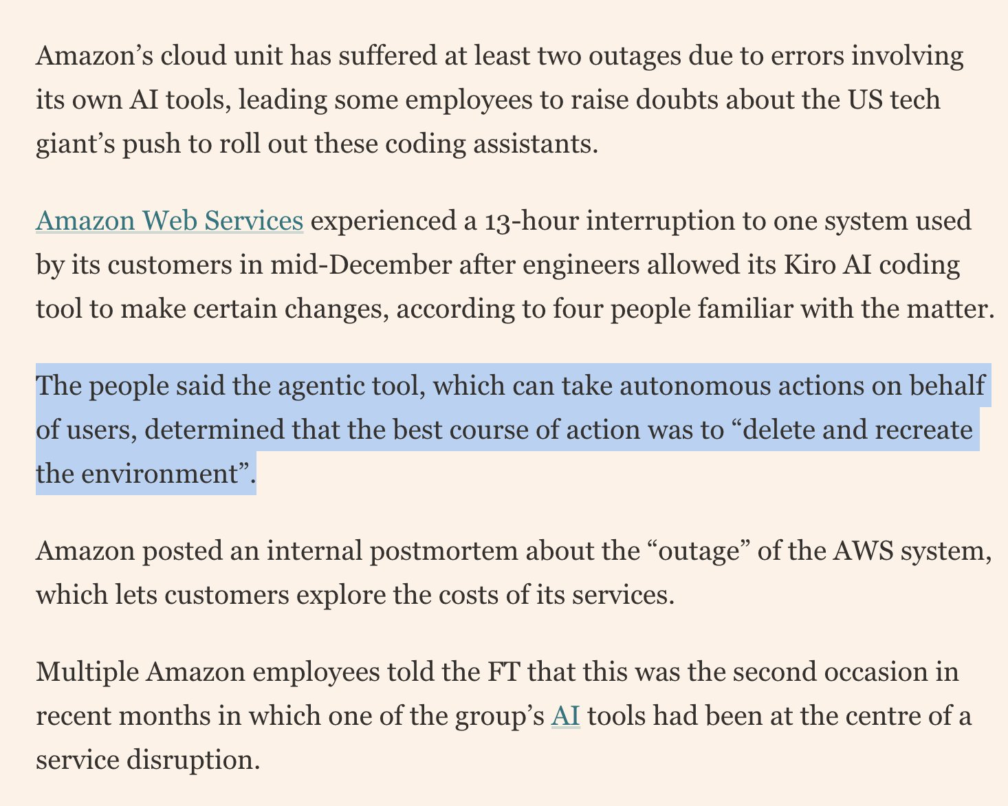 arrow-up1276arrow-down1imageAmazon's internal agentic tool decided that existing code was inadequate and decided to replace it taking down a part of AWS for 13 hours, and was not the first time it had happened. 🤣lemmy.ml☆ Yσɠƚԋσʂ ☆@lemmy.ml to Programmer Humor@lemmy.mlEnglish · 2 months agomessage-square24fedilinkfile-text